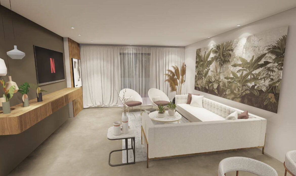 - Open plan living area with fitted kitchen