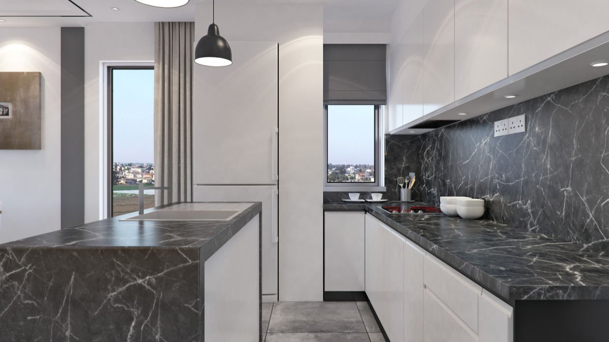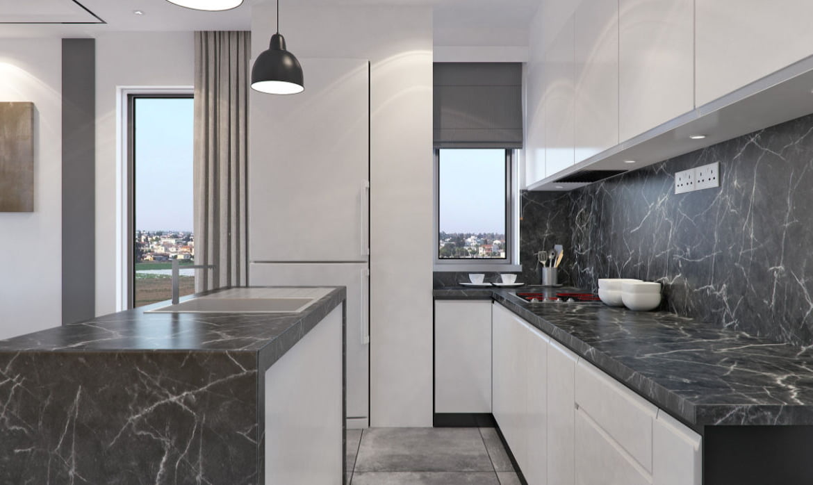 - Open plan living area and fitted kitchen with granite countertops